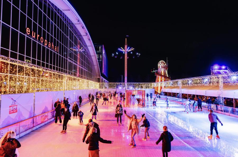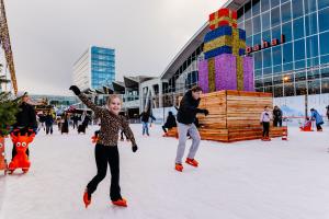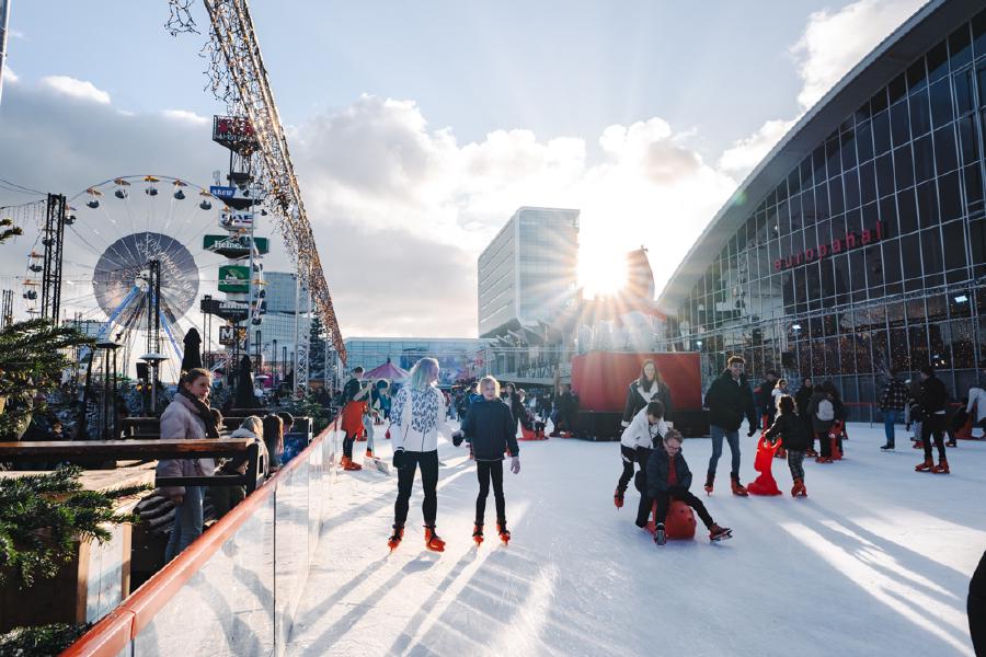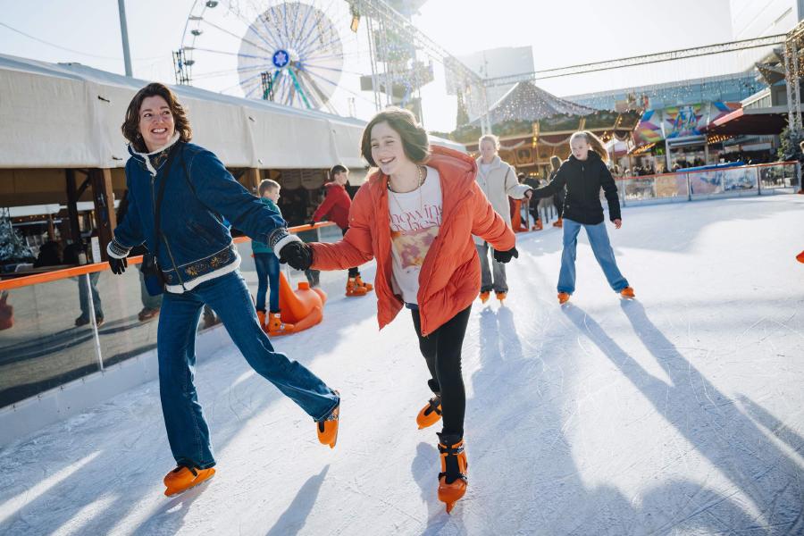 Glij over onze buiten schaatsbaan omringd door sprankelende lichtjes en het feestelijke Winterplein.